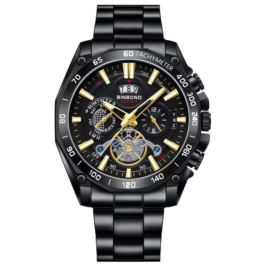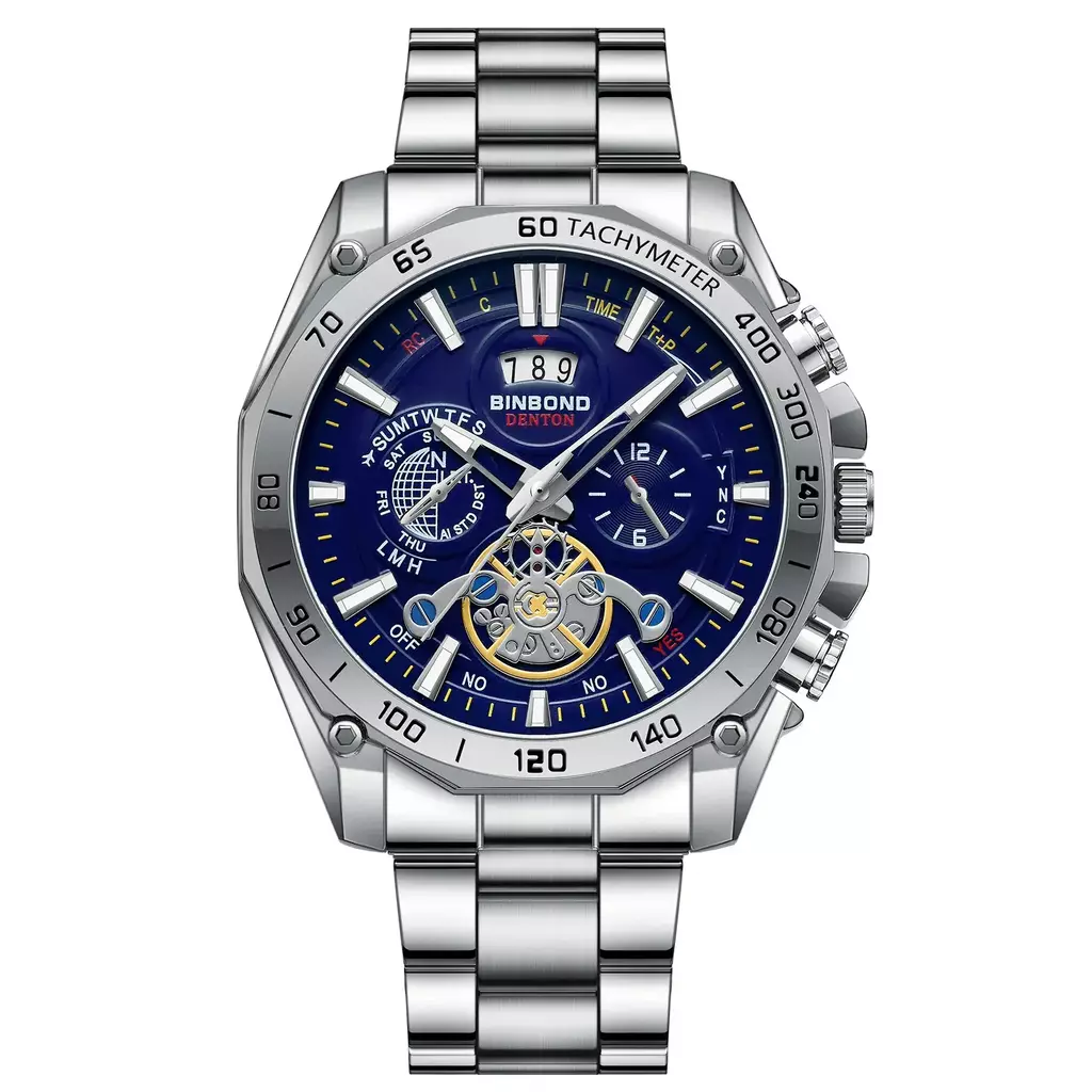 No seu interior, um confiável movimento mecânico automático o alimenta com a energia do seu pulso, dispensando o uso de baterias e celebrando a mais pura tradição da relojoaria. Toda essa tecnologia é protegida por uma robusta caixa e um bracelete em aço inoxidável, garantindo durabilidade e uma presença imponente.