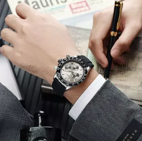Seu visual é inconfundível. O aclamado mostrador "Panda", com seu fundo claro e sub-mostradores escuros em contraste, oferece uma legibilidade impecável e um charme vintage que evoca a era de ouro do automobilismo. Circundado por um bezel com escala de taquímetro, ele não é apenas um relógio, mas um instrumento de precisão. Sua versatilidade incomparável o torna o companheiro perfeito para qualquer ocasião, do escritório a um evento casual no fim de semana.