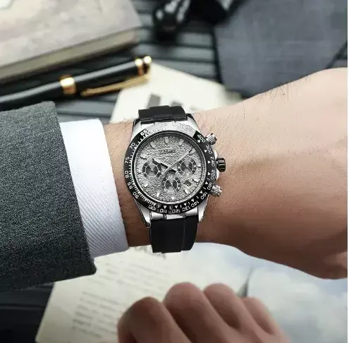 Um tributo a um dos designs mais icônicos e celebrados da história da relojoaria. Este cronógrafo automático é uma peça de pura elegância esportiva, criada para o homem que aprecia a tradição, a precisão e um estilo que transcende o tempo e as tendências.
