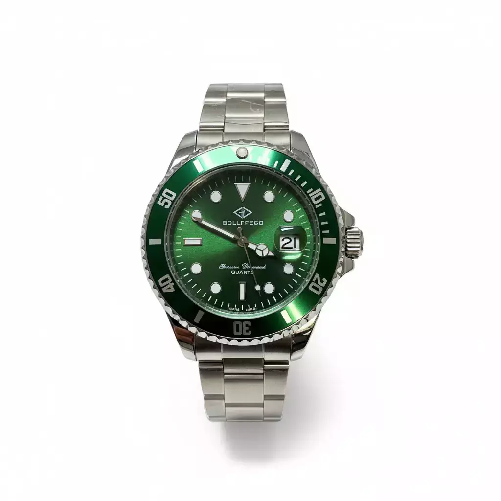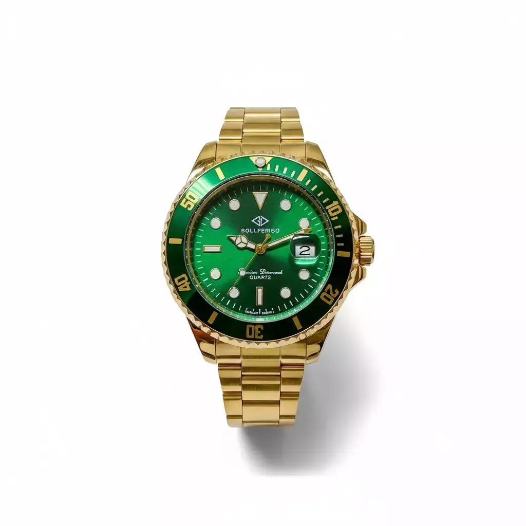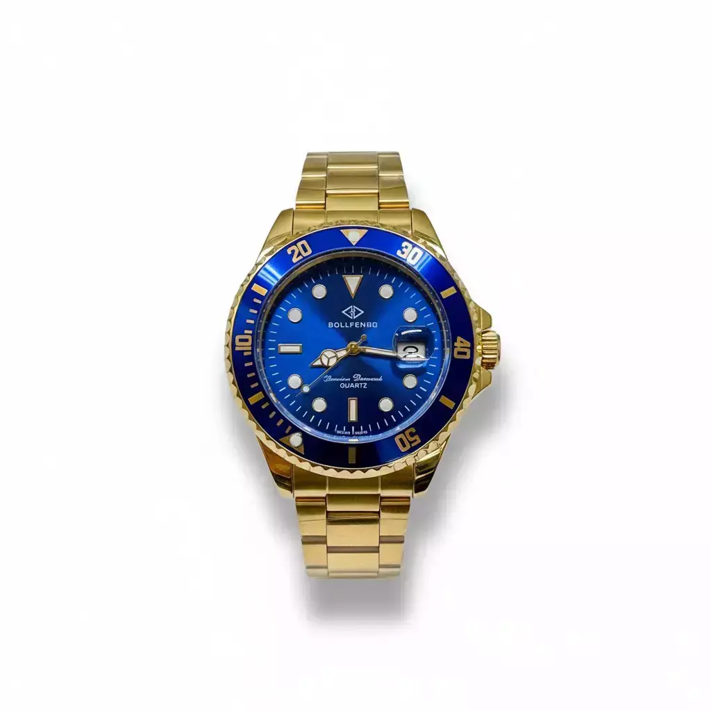 Adicione um toque de luxo e cor ao seu pulso. Este relógio Bollfendo traz o design clássico dos relógios de mergulho, combinando a imponência do dourado ou prata com um bezel vibrante (azul, verde, vermelho, preto ou dourado). Com mostrador de data e resistência à água para o uso diário, é o acessório perfeito para elevar seu estilo com um excelente custo-benefício.