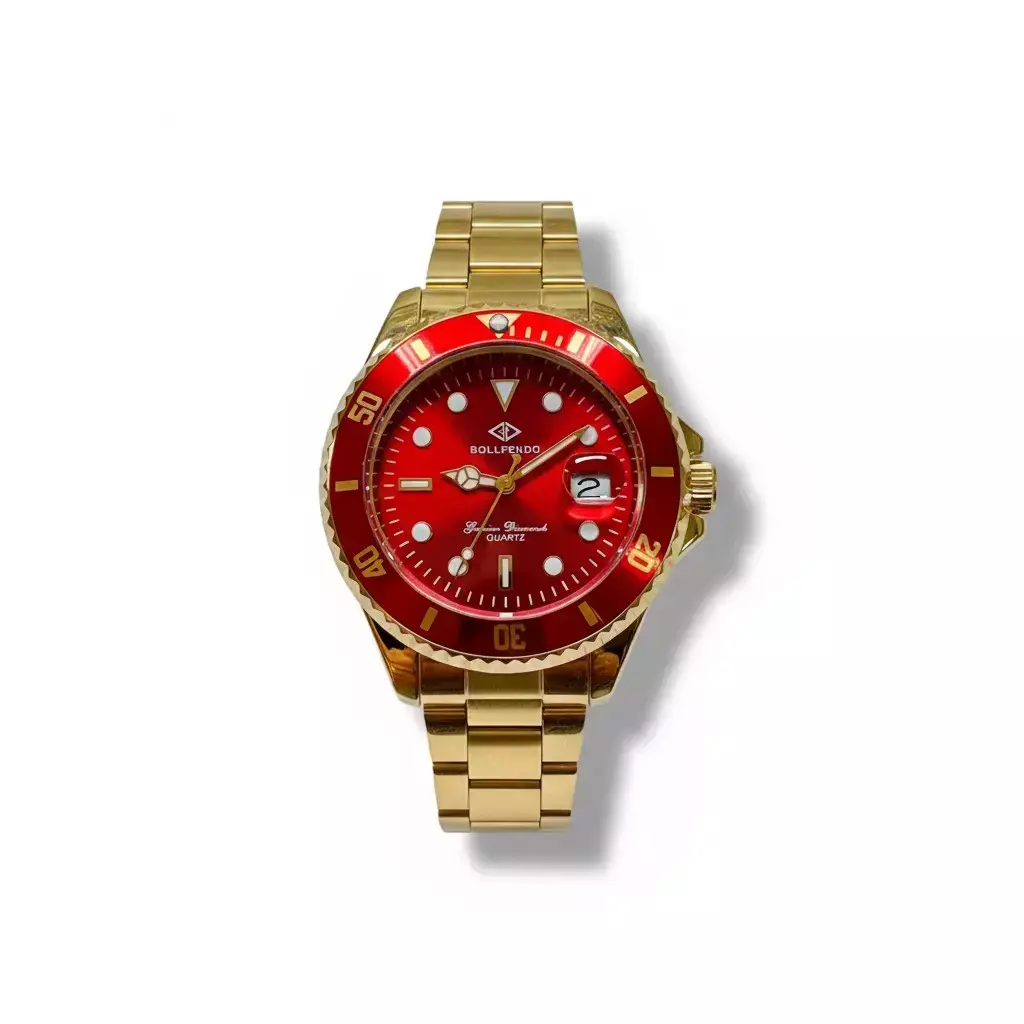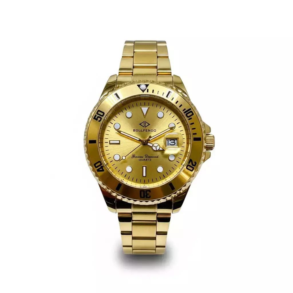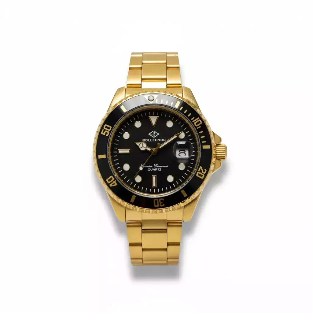 Adicione um toque de luxo e cor ao seu pulso. Este relógio Bollfendo traz o design clássico dos relógios de mergulho, combinando a imponência do dourado ou prata com um bezel vibrante (azul, verde, vermelho, preto ou dourado). Com mostrador de data e resistência à água para o uso diário, é o acessório perfeito para elevar seu estilo com um excelente custo-benefício.